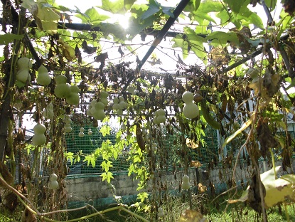 体育倉庫の横には、ひょうたんが鈴なりです。