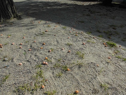 ひょうたん棚の前には、ころころと黄色の実がいっぱい落ちています。ギンナンです!ついこの前までは黄緑色だったのに、熟してきたのですね。