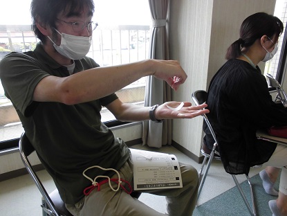 おみやげの手品グッズで、その場での体験タイムとなりました。育生小代表(?)の人気者先生も熱中しまくり。あちこちで歓声が上がっていました。見るだけでなく、体験できるのがいいですね!しかもお家へ持って帰れるのですから、家でも話に花が咲くこと間違いなしです!