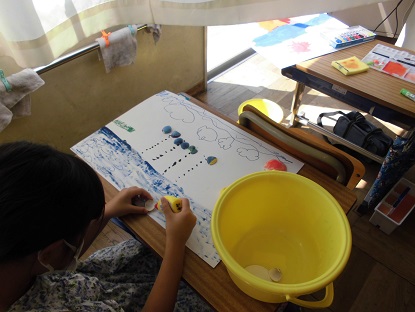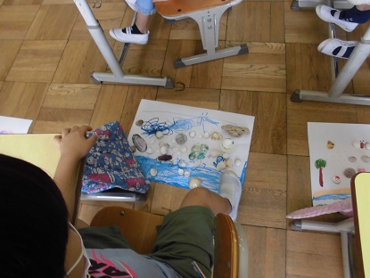 1年生が、海辺で拾ってきた貝殻や流木を使って図工に取り組んでいました。貝殻が人や蝶に変身し、実に楽しい表現活動になっていました。創造力を掻き立てられたのでしょうね!