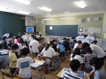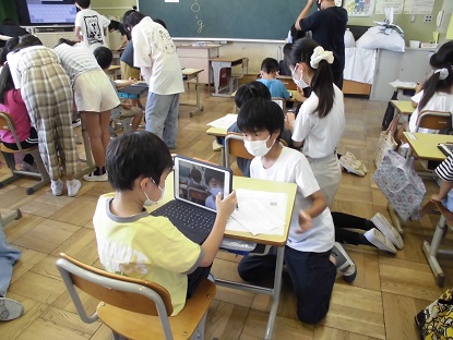 市教委の指導主事の先生も来られていたのですが、「この雰囲気、感動ものですね」と何度もおっしゃっておられました。次の1枚は、写真や動画を撮る体験をしているところです。1年生の「できたという自信」と「すごい、おもしろい」という気持ちが、6年生のエネルギーにもなっていたようです。