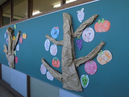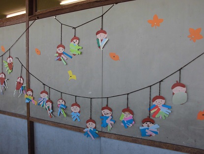 隣のクラスの掲示板は、もうちょっと秋の深まりを感じる作品です。カラフルな “みのむし” です。おしゃれな秋がやってきます!