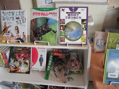 ③図書室に入ったすぐのところに、夏ならではのコーナーが出ています。クワガタがどーんと! 昆虫図鑑、たまりません!