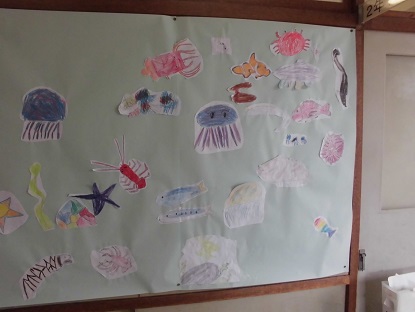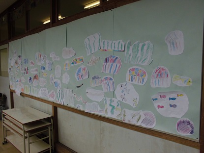 ④2年生の教室前の掲示です! こちらは、国語の教科書に出てくるスイミーのお話の世界を描いたものです。