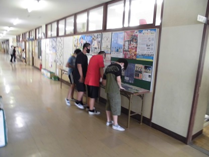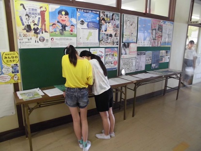 職員室前に、「夏休みにチャレンジしてみよう!」という、募集チラシが置かれています。作文・習字・ポスター・体験活動、