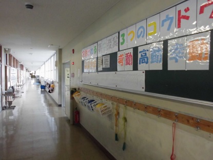 私のお気に入りの校内の風景の中から、とっておきのモノを紹介します。6年生のところから見渡した廊下です。右側の壁を見てください。6年生の意気込みが伝わってくるステキな造語の掲示です。ボールかごの横には、いつもはヘルメットが整然と並べられ、それはそれはすがすがしい気分になれる場所なのです。