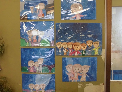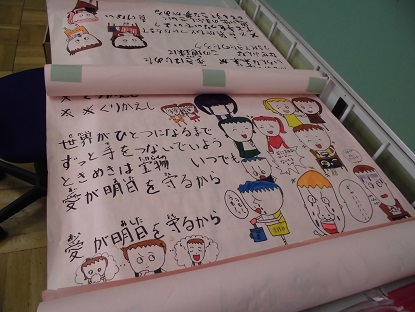 イラストを描くという得意な力が、いろんなところで発揮されています。これは昨年度児童会が作成した、いじめ防止に関する 歌詞付きポスター! 構図、色、表情、とても味わい深く、すばらしいです。