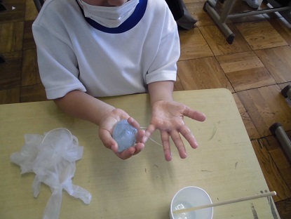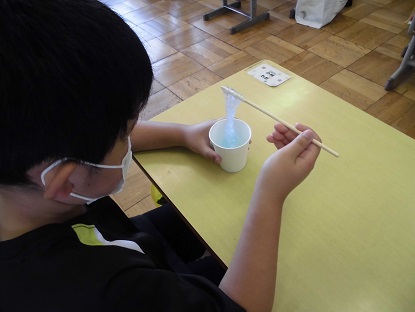 さあ、作業開始です。みんなが化学者に見えてくるくらい、なかなかの手つきでございました! におい、手触り、その変化、熱中しまくり! 夏にぴったりの涼しげな食べ物に見えてきて、「おいしそう!」など 楽しさもマックスでした!