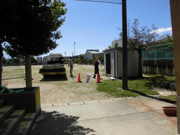 運動場(プール横)にも防災関係の保管倉庫があるのですが、津波や水害での機能性を考慮し、校舎3階の1室を活用し保管しているという状況でした。運動場の倉庫は他の指定場所に移すことになり、本日、解体・運搬作業が行われました。子どもたちに影響がないよう、時間帯等、配慮しながら実施していただきました。