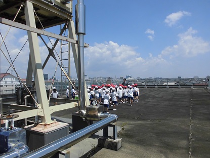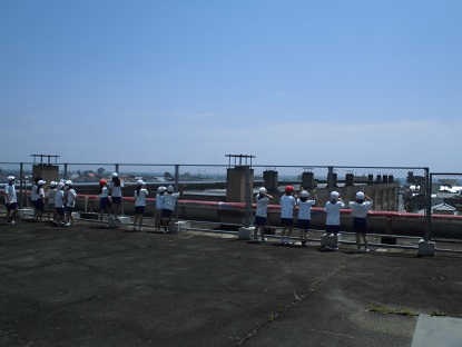 2年生が屋上にあがるというので、同行しました。地域探検で校区のいろんなところへ行ったわけですが、今回は上から見てみる・大きくとらえるということに取り組んでみたのでした。体育や外遊びが中止になることが続いているので、気晴らし・お楽しみの意味も少なからず盛り込んでいます。