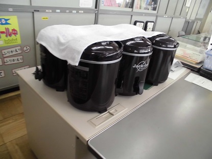 こちらは、水分補給用のウォータークーラー。学年に1個、準備しています。(3年ほど前、PTAにご協力いただいたものだそうです。)持参の水筒がカラになった時などに利用できるようにしています。