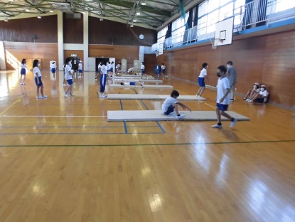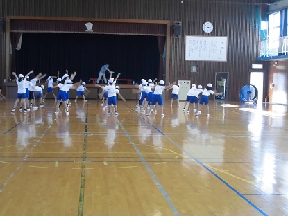 5年生の体育です。ラジオ体操の音楽が聞こえてきたので、体育館へ行ってみました。何をするのかな?という気持ちと、熱中症対策はOKかな?ということも含めて、3階へ上がりました。