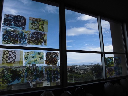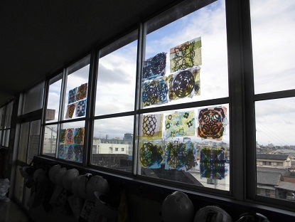 図工の作品が窓に貼られ、美しく輝いていました。