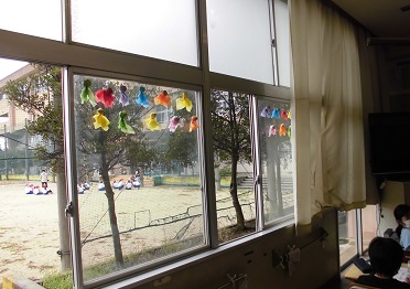 1年生の教室では、カラフルなテルテル坊主群が!
