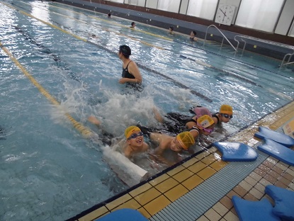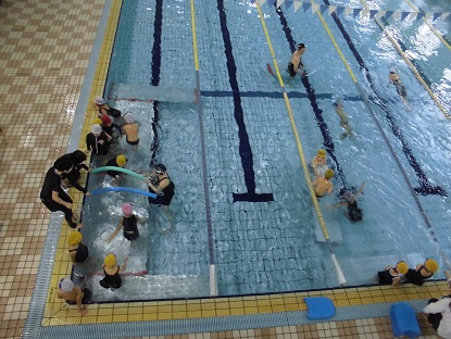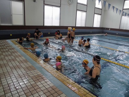 楽しいプログラムを通して、水に親しみながら泳ぐ力を身につけていくのですね。指導者と見守り補助の先生たちがたくさんいることで、非常に内容の濃い水泳の学習となりました。あと2回、楽しみだね!
