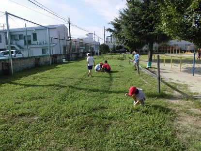手にはイナゴ、かごの中には大きなショウリョウバッタが入っていました! 鉄棒のところの草むらは、畑もあるし、かっこうの虫探し場所です。ええもん見つけたら、また教えてね!