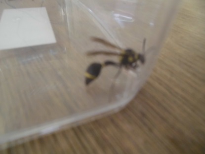 みなさんは、トックリバチと聞いてどんな蜂か思い浮かびますか? 3年生の教室の虫かごに入っていました。虫かごのプラスチック越しなのでぼやけていますが、黒と黄色が鮮やかで、腰のくびれが特徴の蜂です。この蜂の巣が、泥で作られるのですが徳利(とっくり)のような壺の形なので、この名前があります。子育ても非常にユニークです。攻撃性は低く比較的穏やかな蜂です。