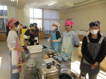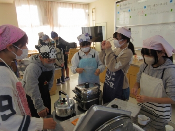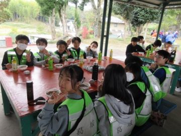 訓練のあとは神戸野外活動センターへ移動し、炊き出しの「非常食」として、「α米」で作った「わかめごはん」と、「豚汁」をいただきました。