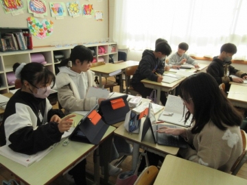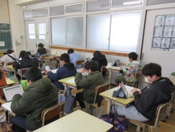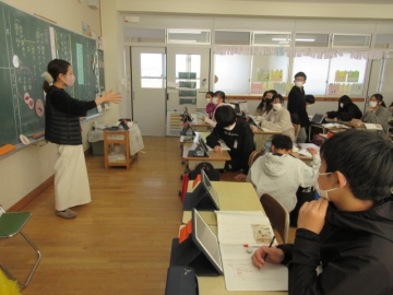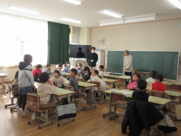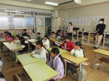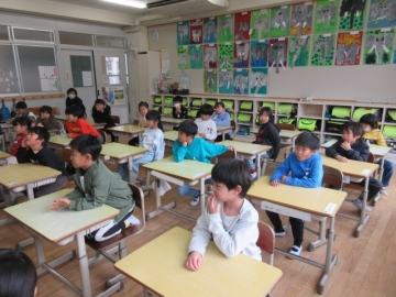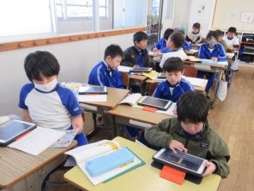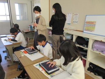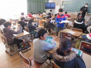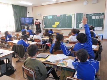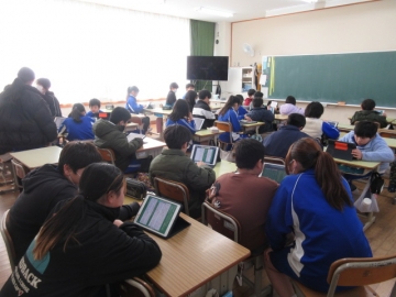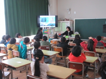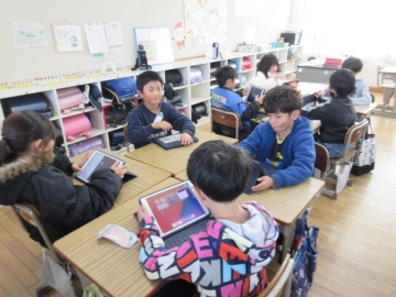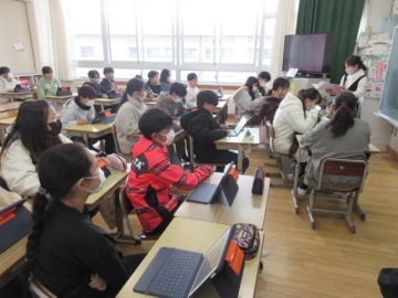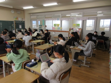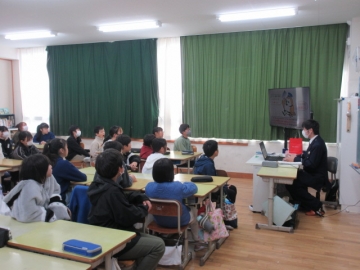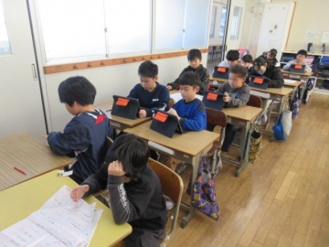 【1年生】 色々な物語の動画を視聴し、先生のお話を聞いています。みんな集中できていますね。