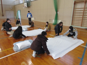 「2本の棒」と「1枚の毛布」で、「たんか」を作る方法も教えていただきます。