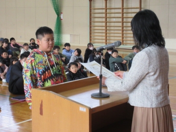校長先生からのお話のあとは、校内図工展で入選した児童の表彰です。