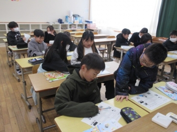 「友情のかべ新聞」のテストを返してもらいました。みんなで正しい答えを確認しています。