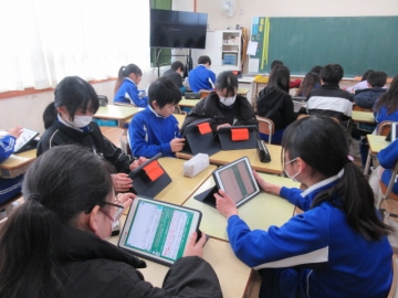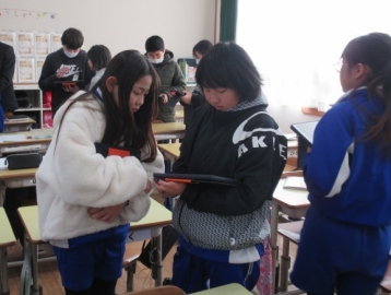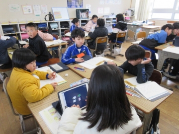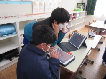 「テスト返し」の時間です。お直しが終わって先生に丸をもらた子は、タブレットで漢字の練習をしています。