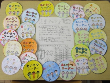 各学年が1週間ずつ「あいさつリーダーバッジ」をランドセルにつけ、率先してあいさつをします。
