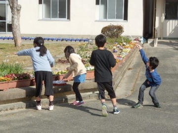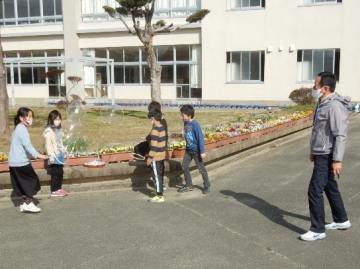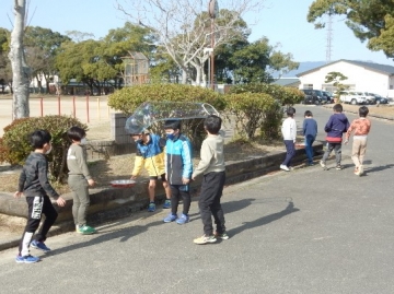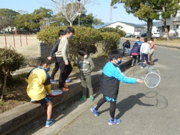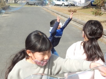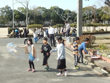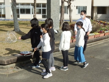 3年の子どもたちが、大きなシャボン玉づくりを行っていました。先日に実施した1年の特別授業が職員室内の話題に上がって、早速に実現した中村先生の授業です。今回も子どもたちの楽しそうな表情を見ることができました。