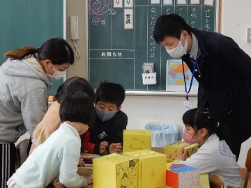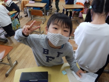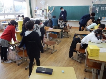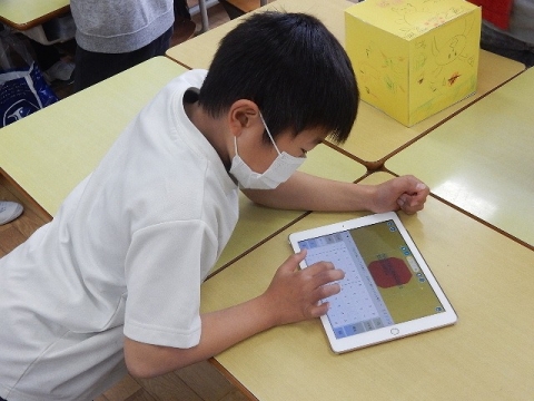 GIGAスクール支援員の方に来ていただきました。この取り組みも回数を重ねてきたので、最近は授業者の技術的なサポートに徹してもらっています。2年の子どもたちは、タブレット型パソコンのカメラ機能を使って写真を撮った上、それにコメントなどを書き込んで、授業者のパソコンに送信する方法を習っていました。今後の授業において行うであろう「個別課題の提出」の練習です。