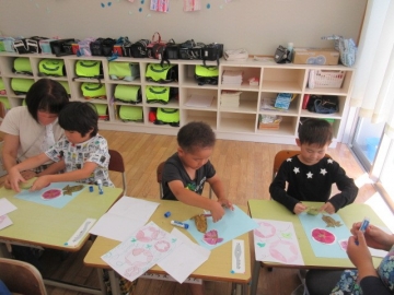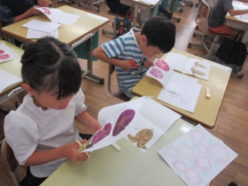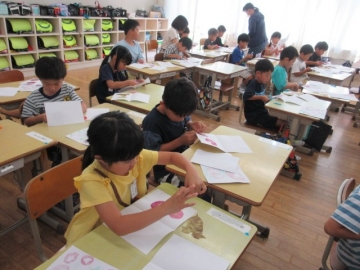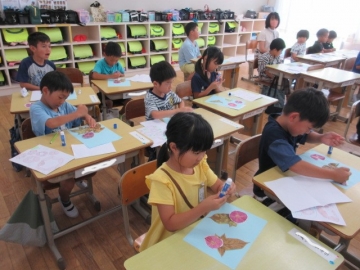 せんしゅうは、あさがおの はなびらをつかって、「いろみずあそび」を しました。きょうは、つくっておいた おしばなをつかって、 さくひんを かんせいさせます。