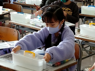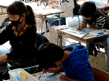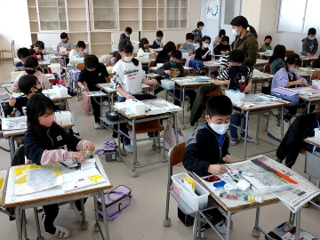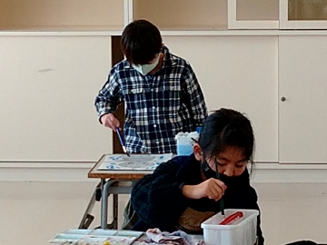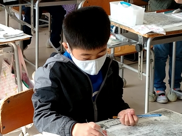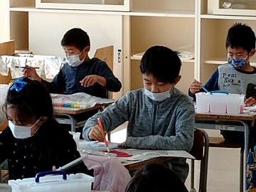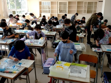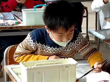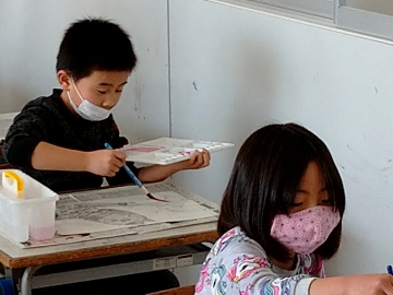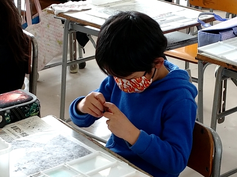 図画室に入ったら、2年の子どもたちが楽しそうだったので、しばらく観ていました。それぞれが作った鬼の版画に色を付ける活動です。子どもたちは、色の混ぜ合わせや濃淡なども考えながら行っていました。