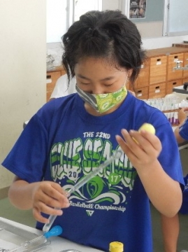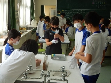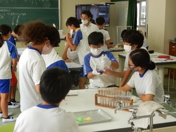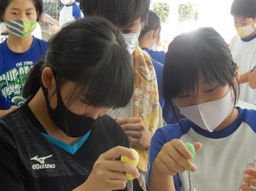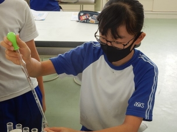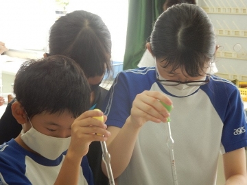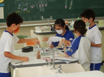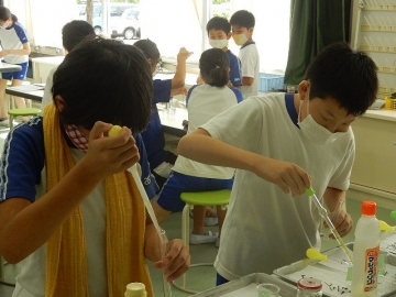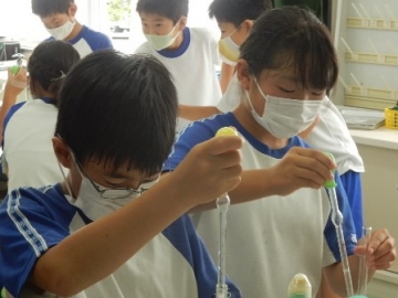 紫キャベツを使った水溶液の仲間分けを実験していました。教科書が提示していない種類の水溶液もあって、とても面白そうな内容です。子どもたちも、すごく食い付いていました。