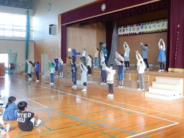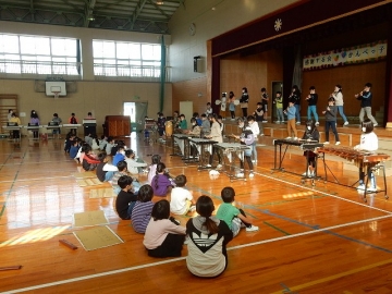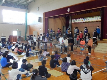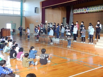 【5年:発表「稲作体験」と合奏「もみじ」、合唱「夕やけ こやけ」】