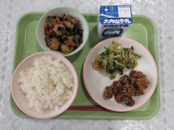 ・むぎめし ・カツオのごまソースからめ ・こまつなともやしのあえもの ・ヒジキとジャガイモのいために ・牛乳