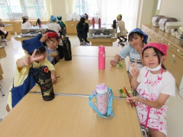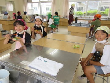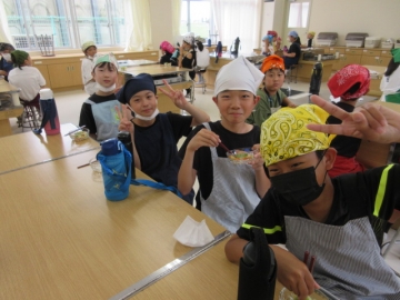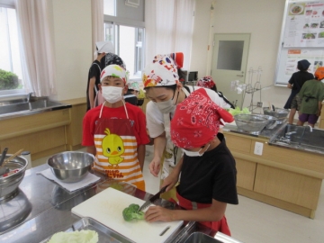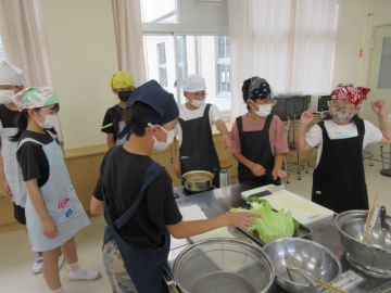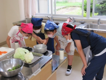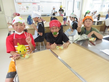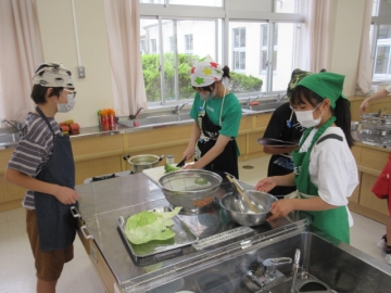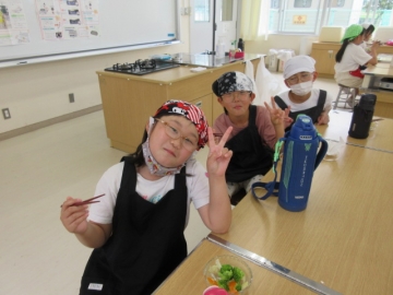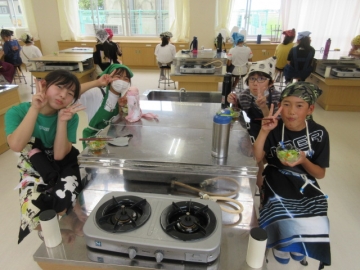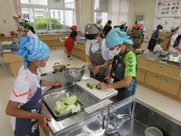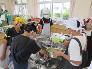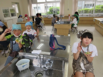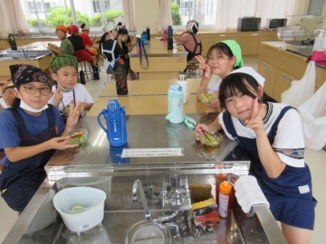 初めての調理実習です。どうすれば手際よく作業を進められるかみんなで考えながら、おいしい「ゆで野菜サラダ」を作ることができました。