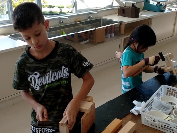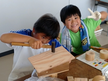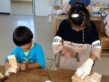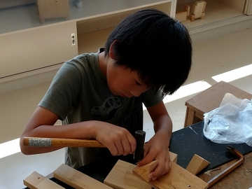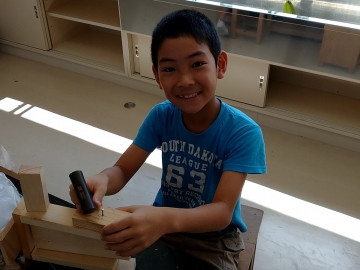 様々な形の木材を組み合わせて「もくもくモンスター」を作っていました。釘を真っすぐに打ち込むことが難しいようです。真剣な良い表情でした。