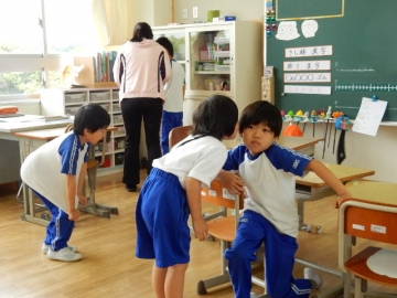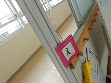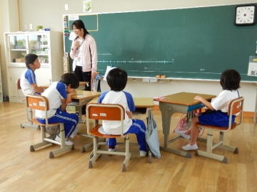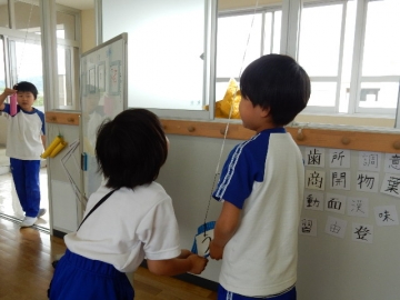 今日は、6年生と3年生2人と1年生の4人で、長音の学習をしていました。2人の子が先生にお題を聞きに行き、それをペアの子に伝え、いっしょに「あ・い・う・え・お」の文字にゴムがついているグッズのところにいって、「おかーさん」とか「ちょーちょ」とかの長音の表記を確認しながら、ゴムをひっぱります。体を使い、音と表記を一致させながら学習を進めていました。
