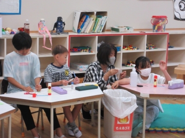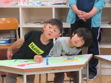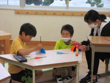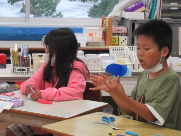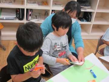 みんなでいっしょに、いつも素敵な作品を作っています。今日は、色紙で「カサ」の作成に取り組みます。