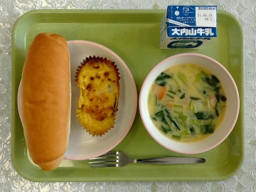 2年から6年までの給食が始まりました。今日の献立は、牛乳とパン、シイラのカレー風味焼き、豆乳のコーンスープです。美味しくいただきました。