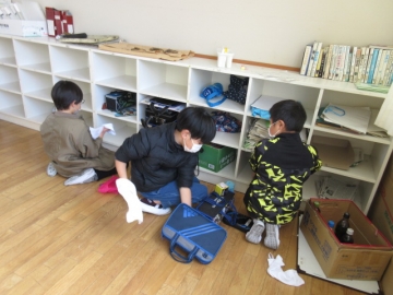 いったん、ロッカーの中の物を出してから、ぬれぞうきんでふいています。