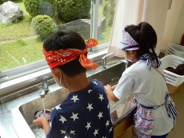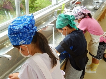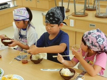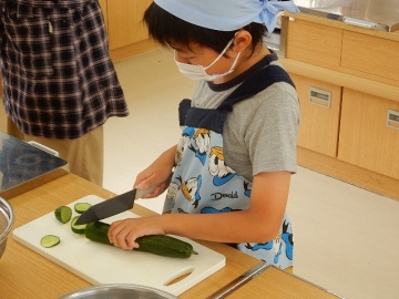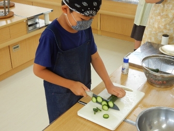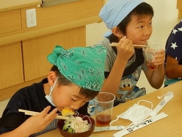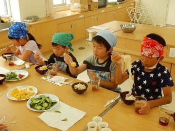 素麺づくりを行いました。全員が協力し、麺を茹でたり、野菜を洗って切ったり、配膳したりしました。野菜は、子どもたちが育てたものです。「素麺、嫌い…。」と言っていた子も、野菜が苦手な子も、「美味しい。」や「甘いなぁ。」などと言って、箸が進んでいました。