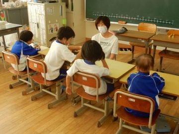 たし算の学習を進めていました。ブロックを使った袋リレーについても、子どもたちは活動の要領を得、互いに問題を出したり出されたりしていました。