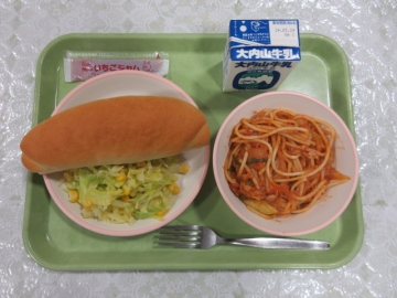 3月12日の給食「ツナとトマトのスパゲッティ」