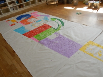 時間をみつけて、こつこつと進めている貼り絵が、だいぶできてきました。でも、まだ何ができるかわかりませんね。