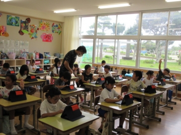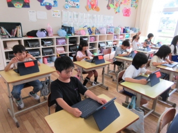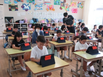 タブレットを使って、お楽しみ会の準備をしています。