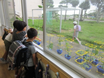 教室のまどからは、育てている野菜をすぐに見ることができます。