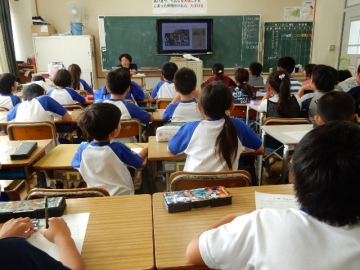 総合的な学習の時間に、神戸地区の歴史について、地域の藤波さんがフィールドワークをしながら、お話をしていただけるので、今日は、事前に学年で集まって昔の神戸小学校について学習していました。