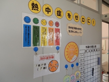 保健室前廊下の掲示も、7月下旬から熱中症の予報などを知らせる内容が続いています。一日も早く涼しい秋風が吹くことを、心から願っています。