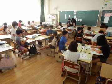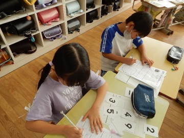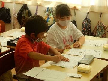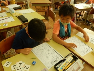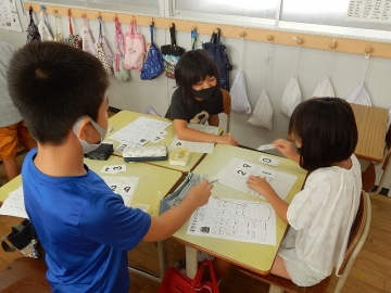 「算数大王」の問題に挑戦していました。2桁までの数字を使った足し算や引き算の学習です。子どもたちは、ペアの子と一緒になって、ああでもない、こうでもないと話し合っていました。